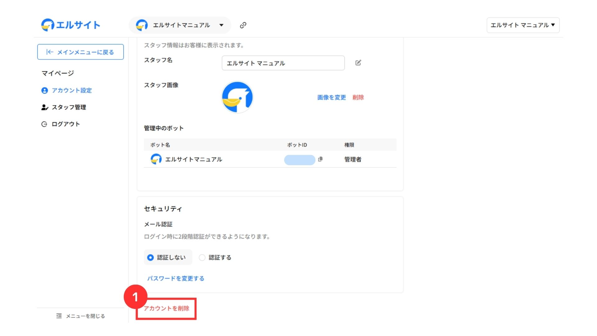 ①「アカウントの削除」をクリック