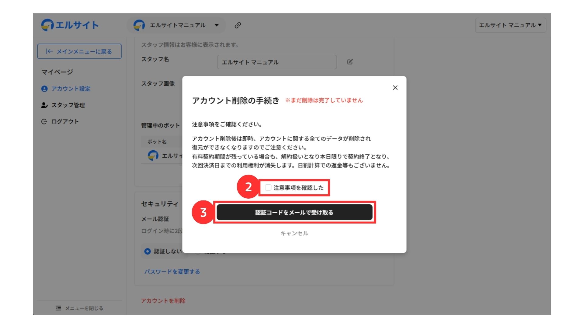 受け取ったメールの案内に従って、アカウント削除を行ってください。