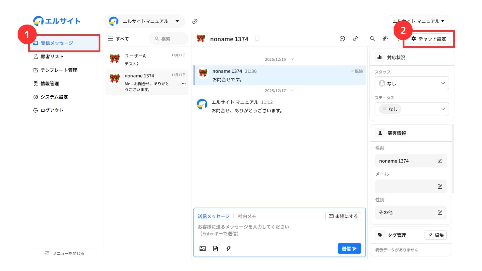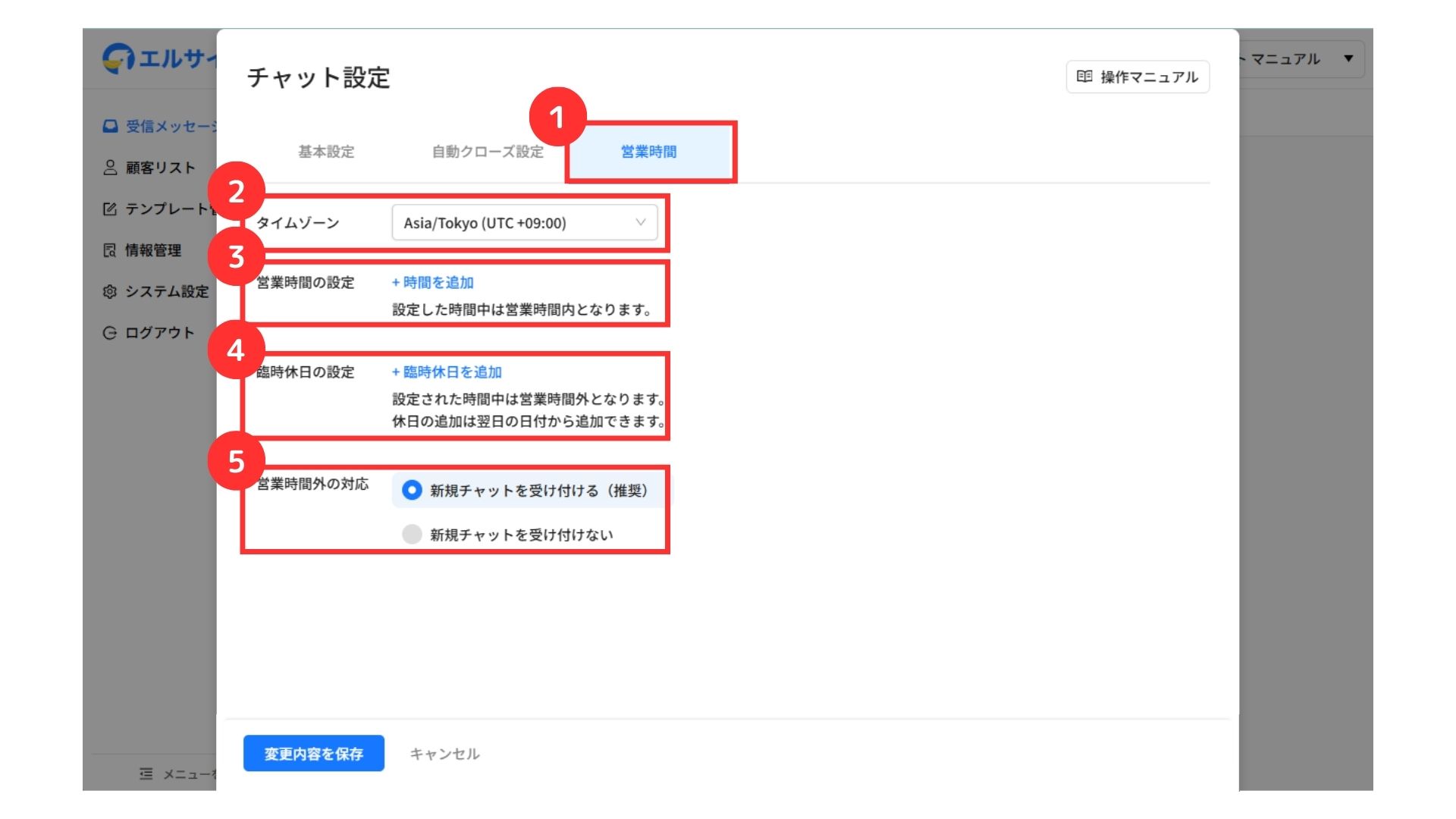 チャット設定は、顧客対応時のチャット設定や応答時間などの設定が可能です。