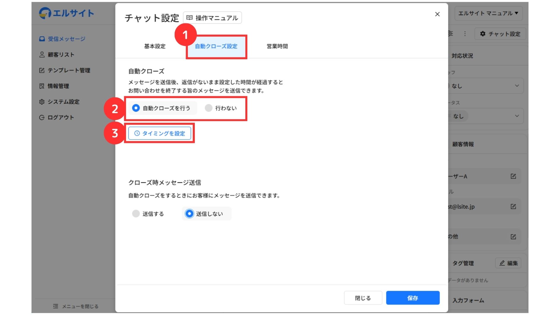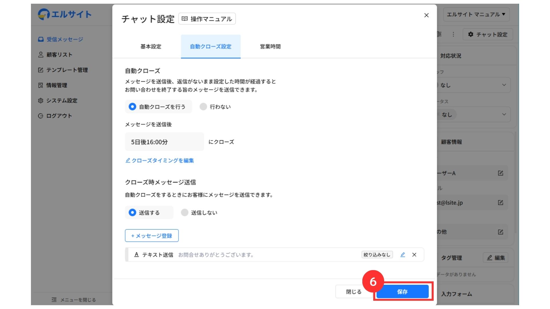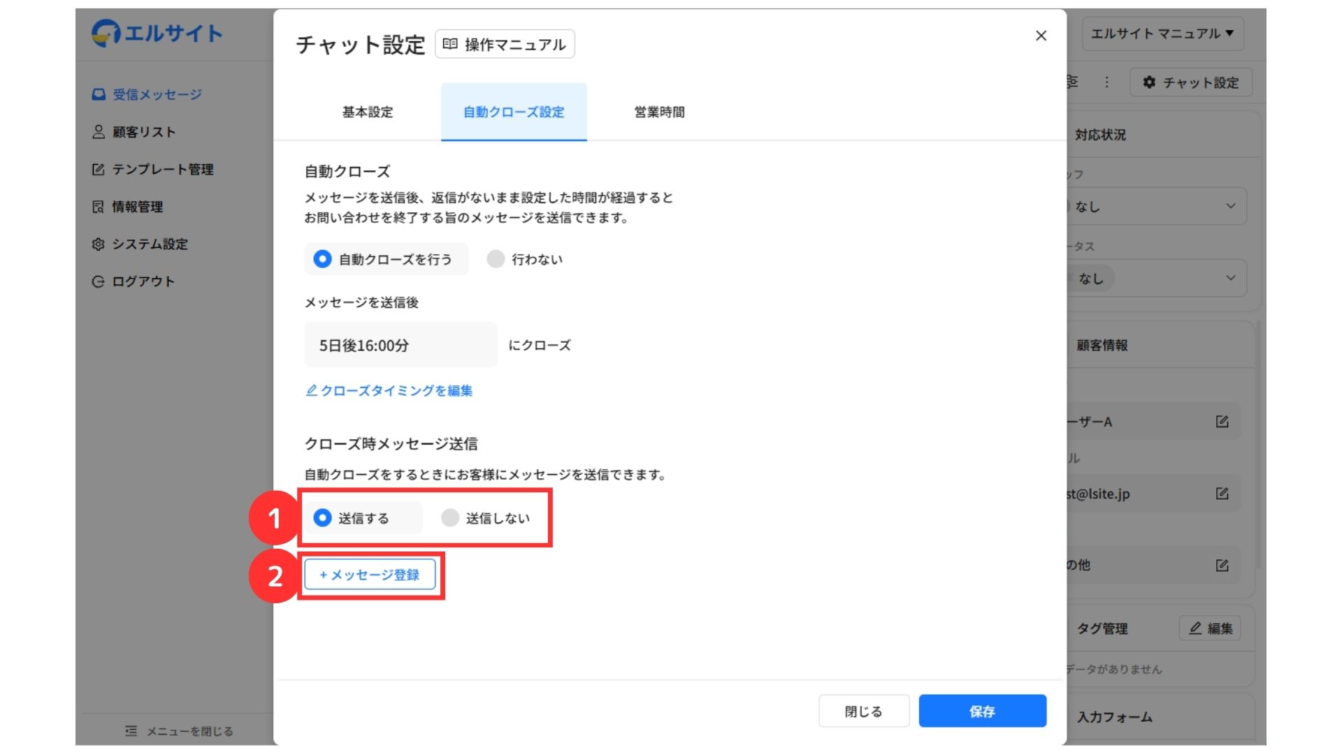 自動クローズの際にメッセージを送信する場合は、以下の設定を行ってください。