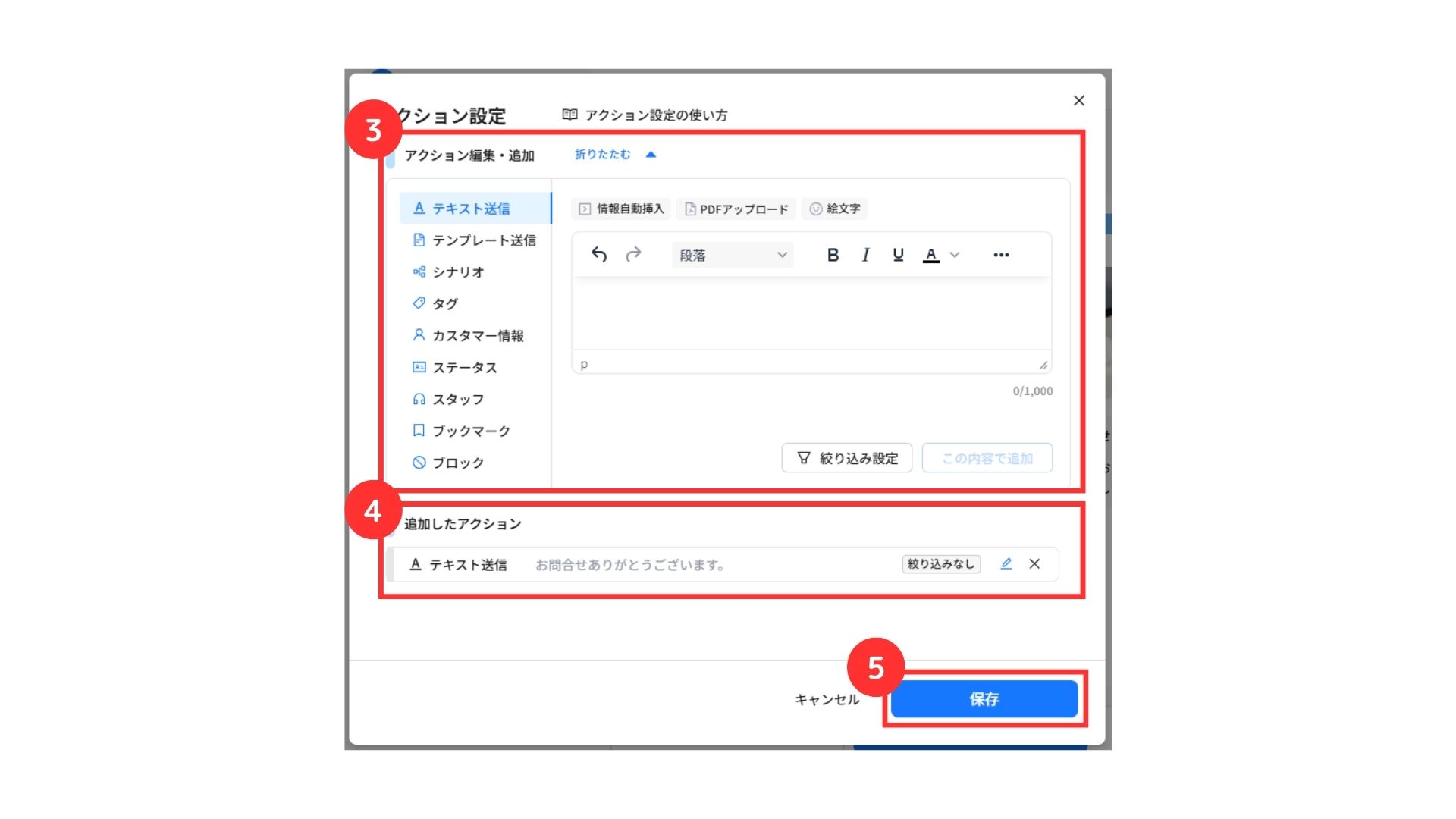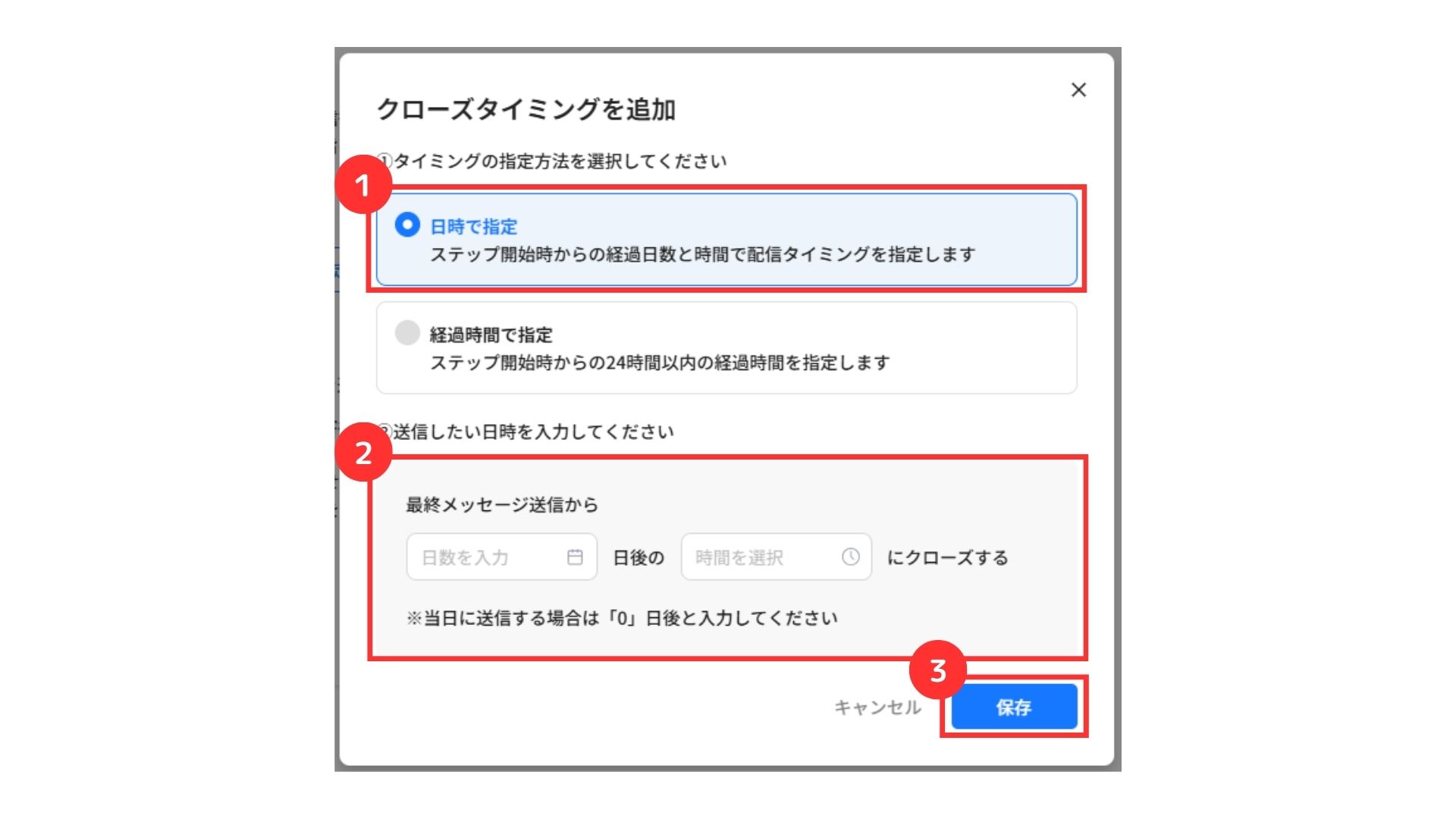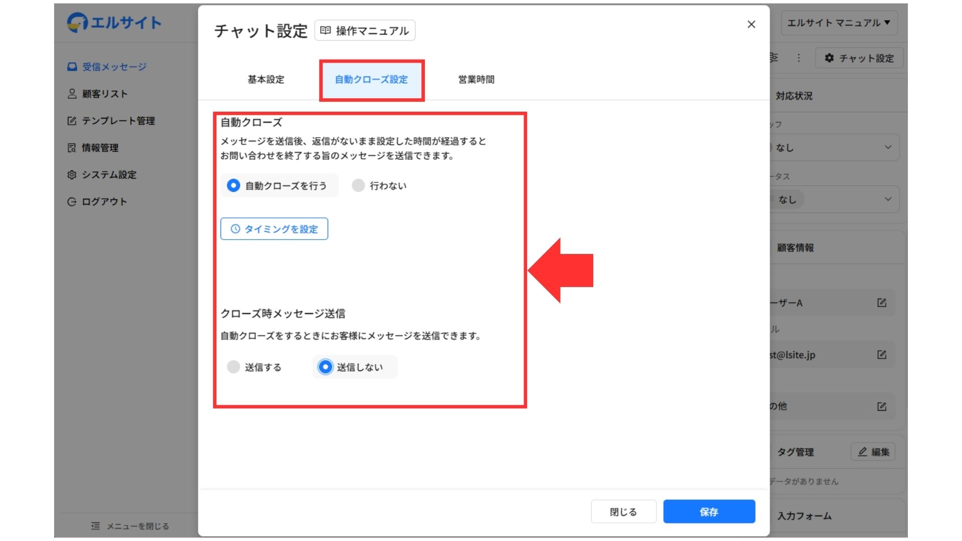 自動クローズの際にメッセージを送信する場合は、以下の設定を行ってください。