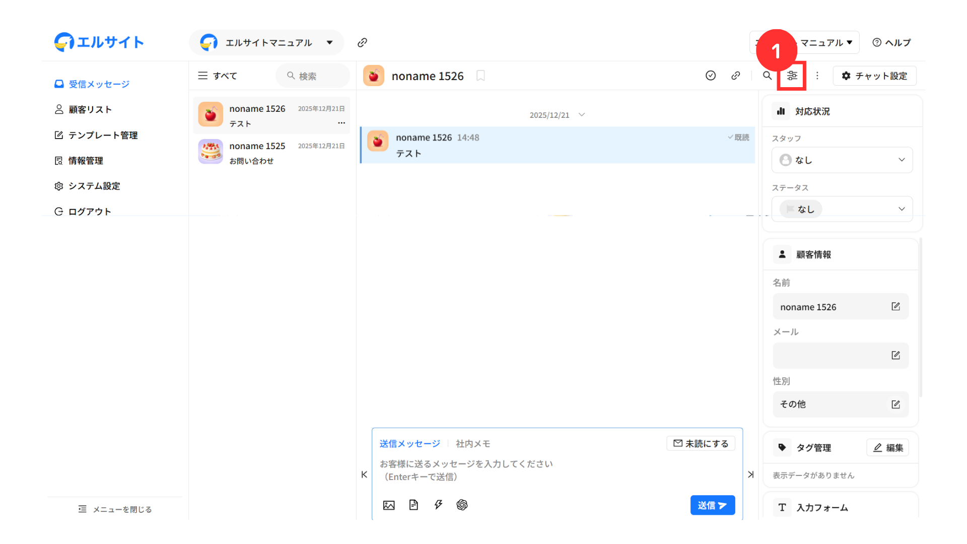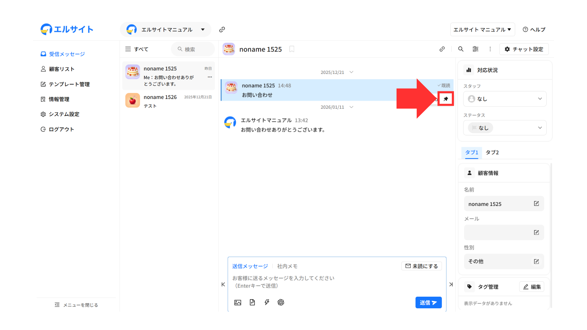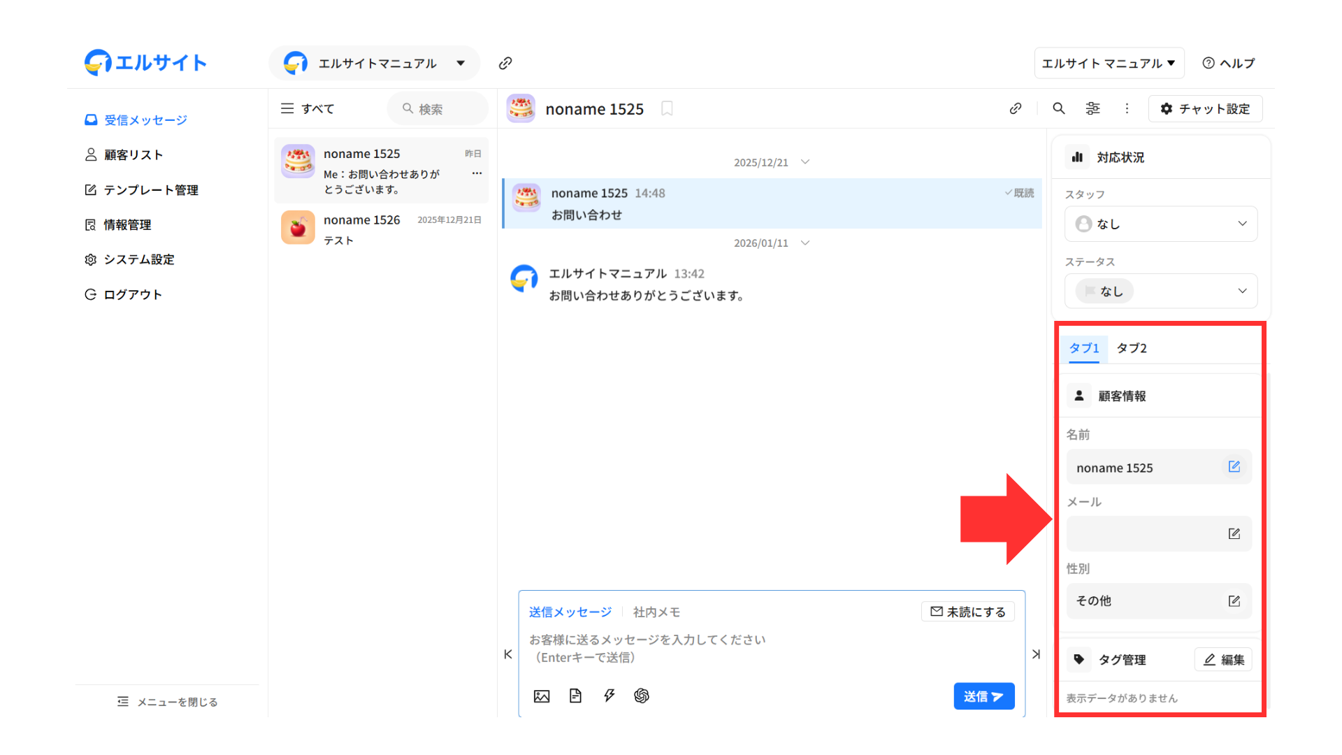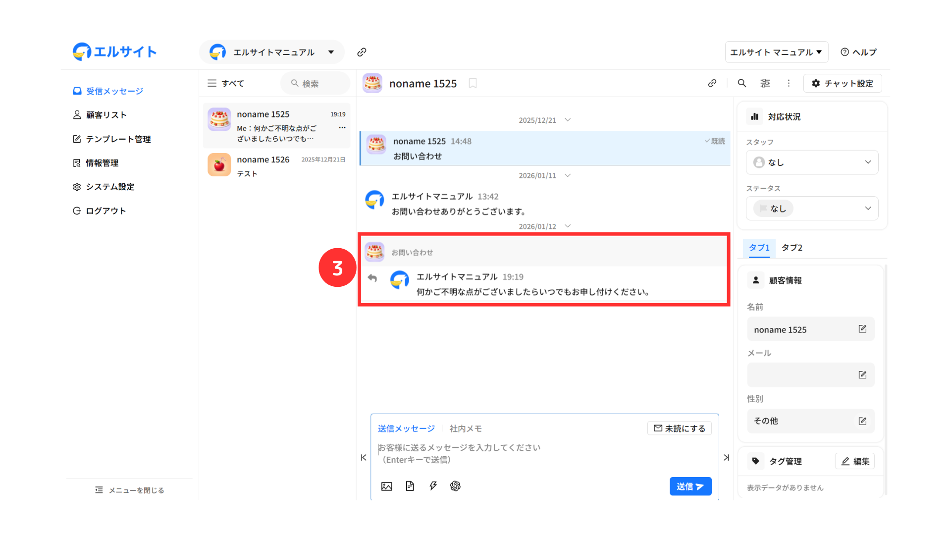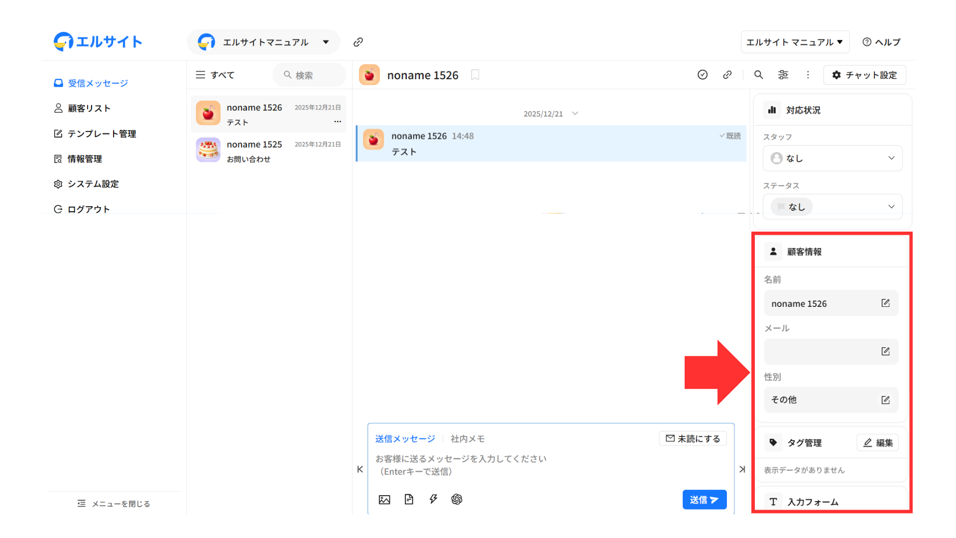メッセージを送信している顧客の情報などをすぐに確認・編集することができます。