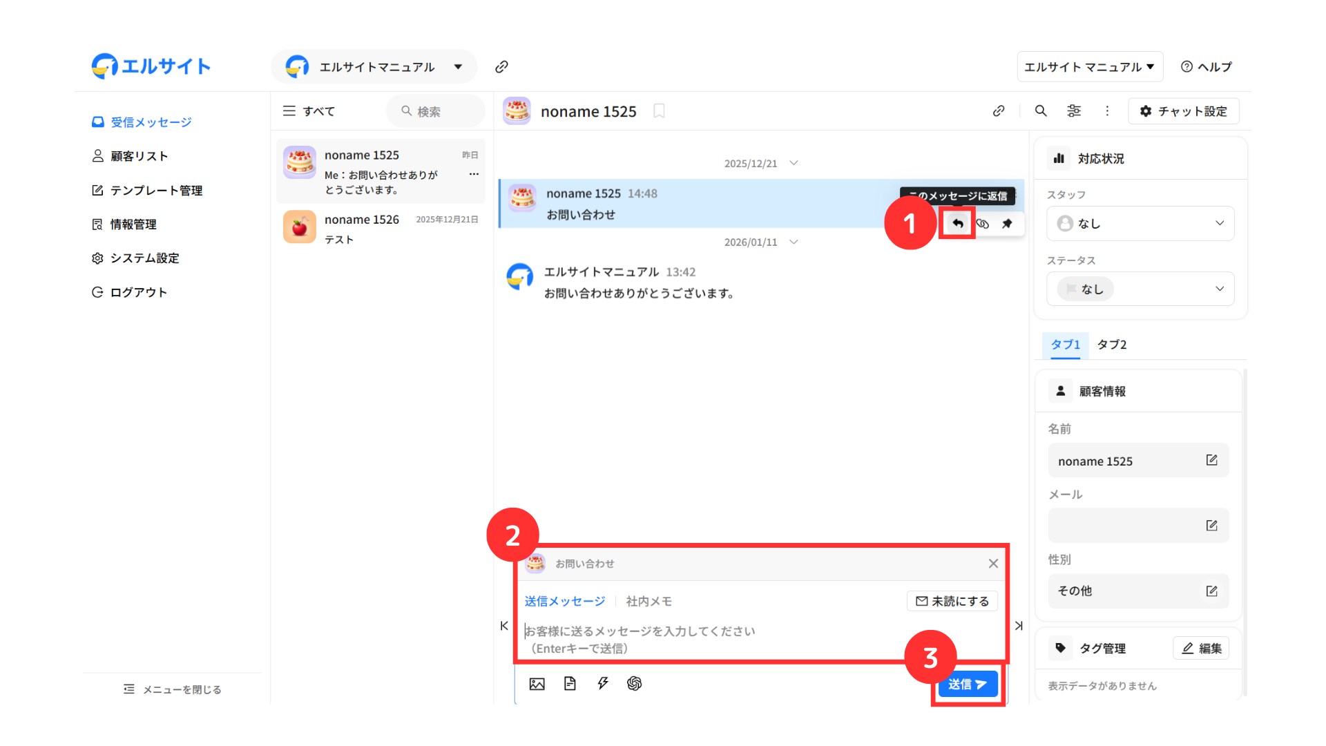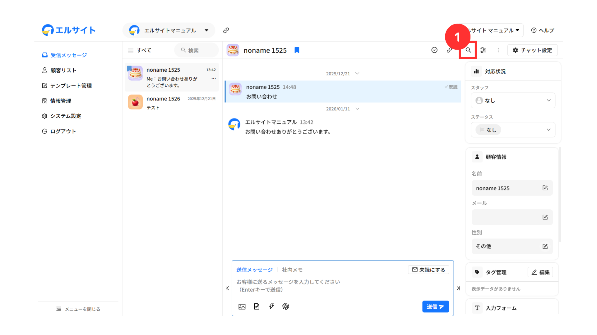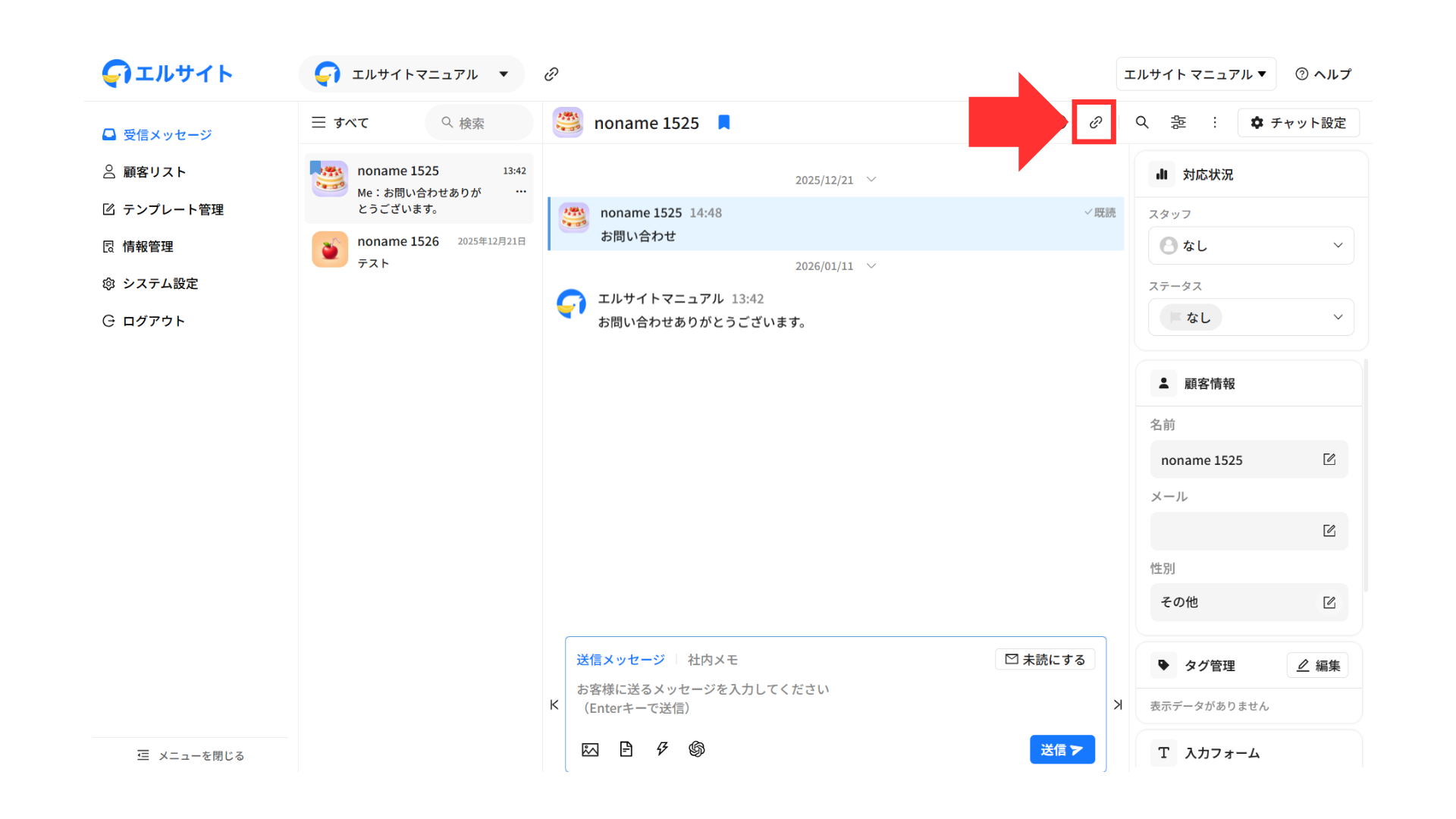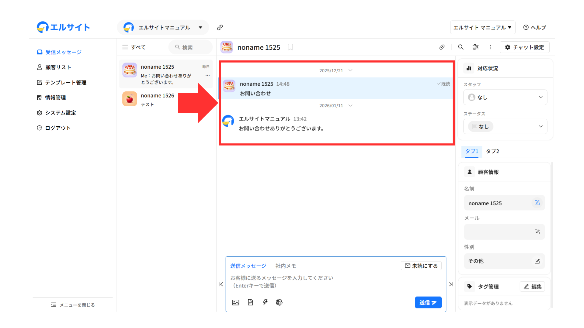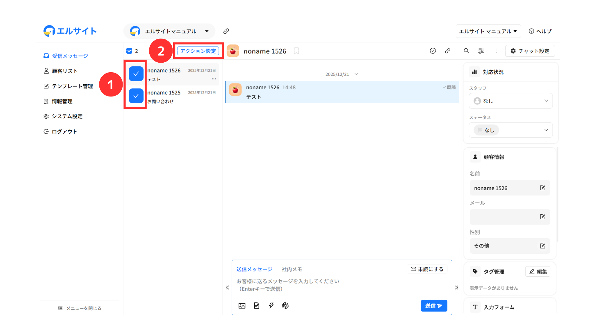 メッセージを送信している顧客の情報などをすぐに確認・編集することができます。