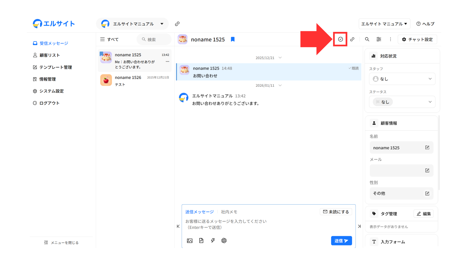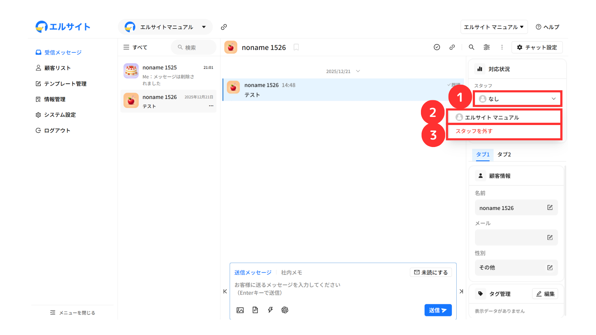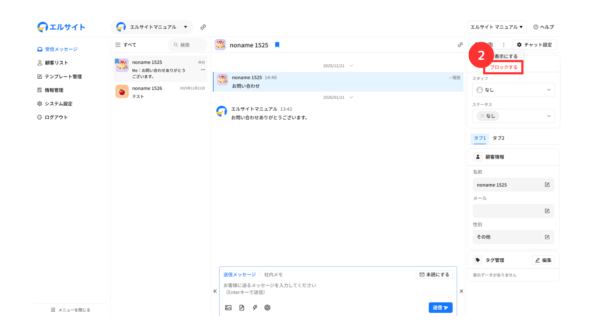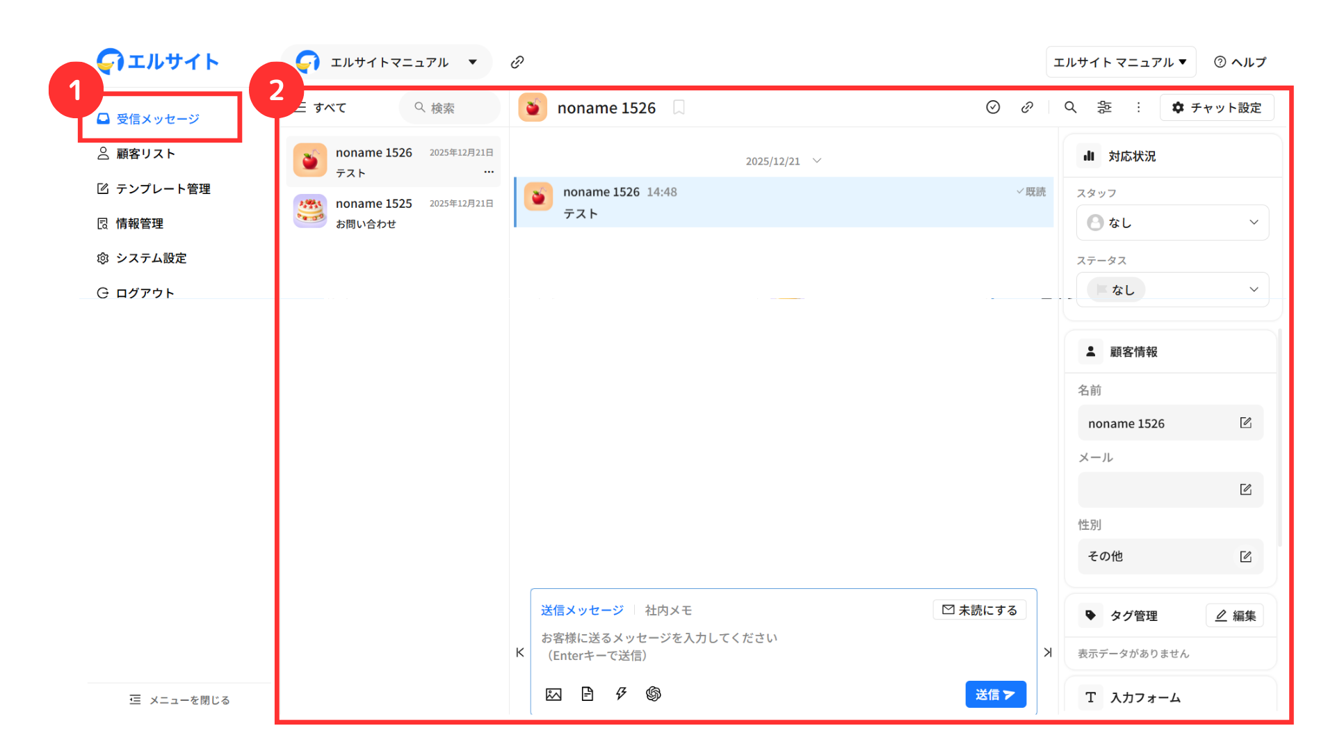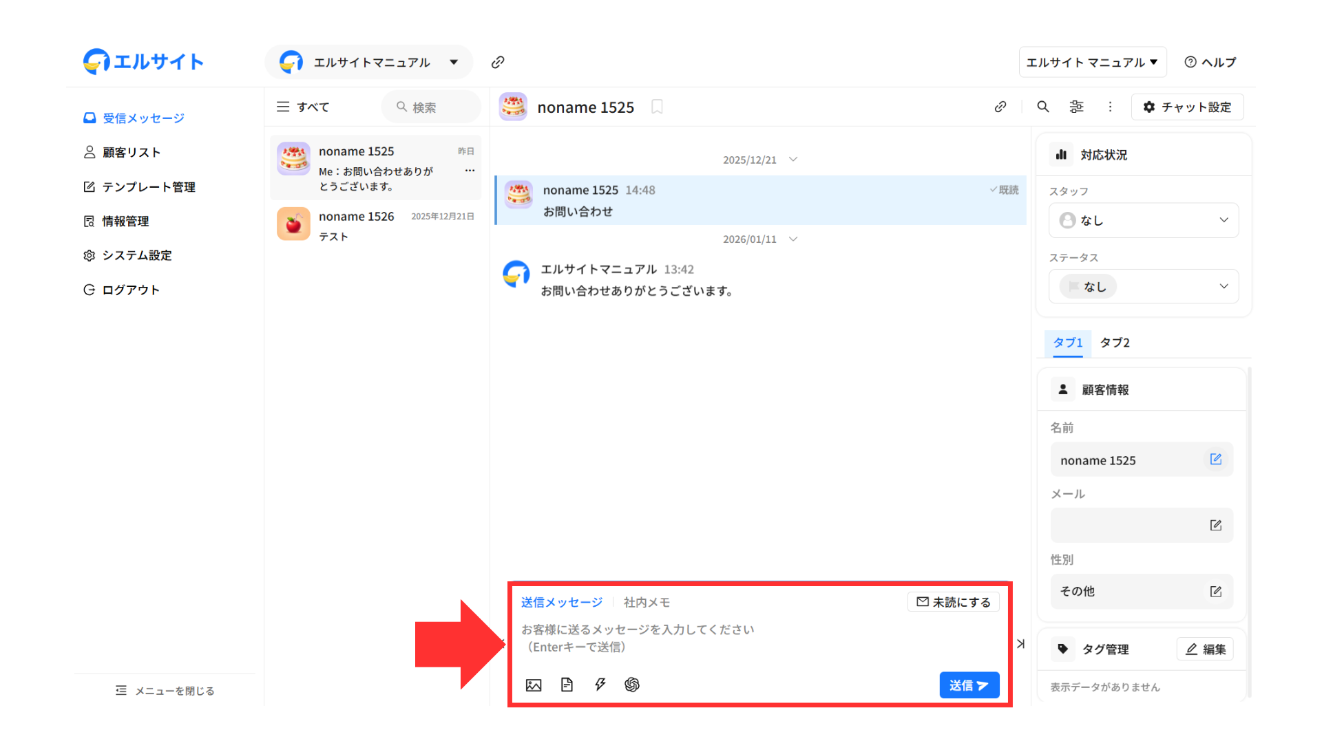 メッセージを送信している顧客の情報などをすぐに確認・編集することができます。