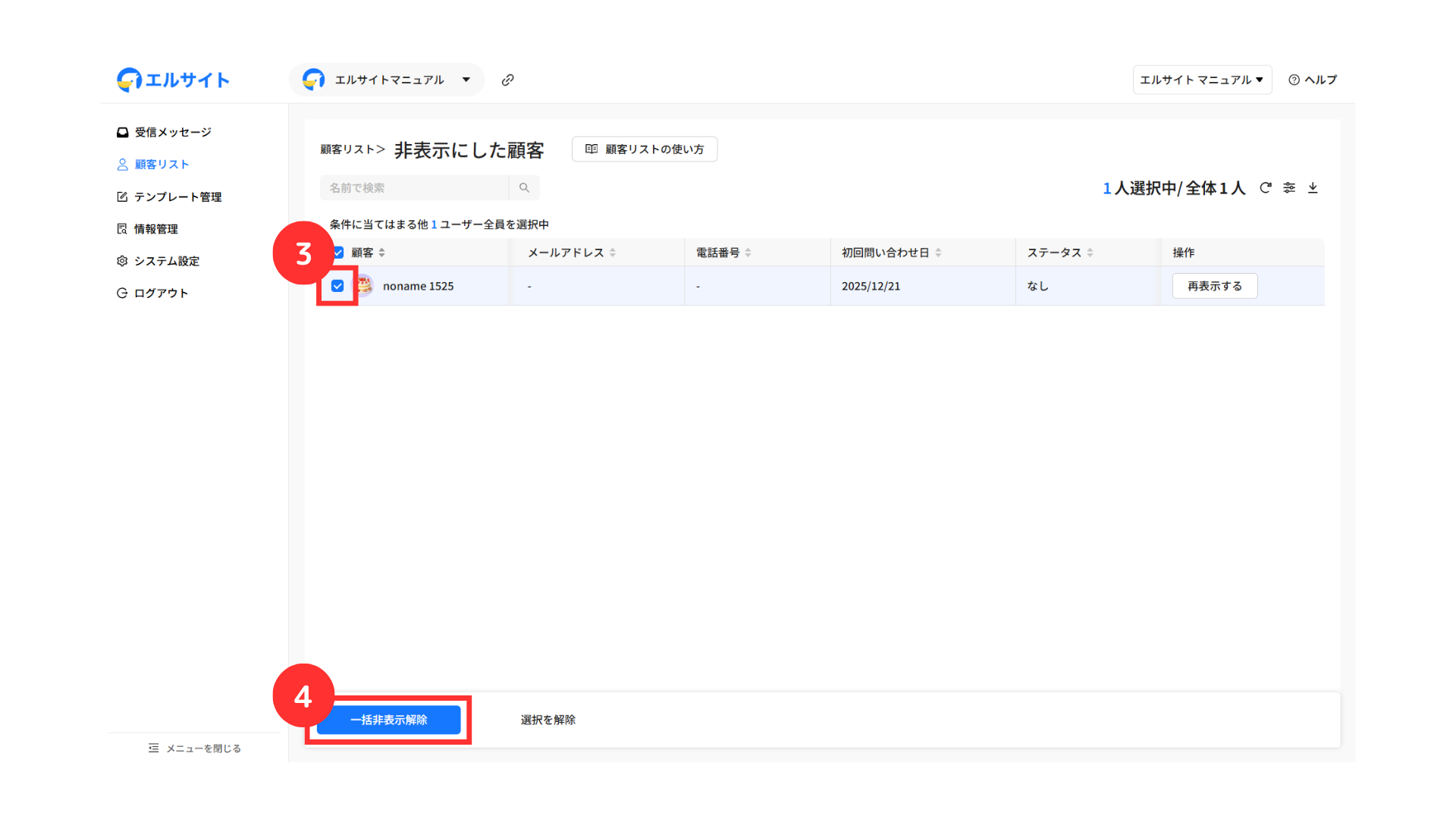 非表示にした顧客を再表示したい場合