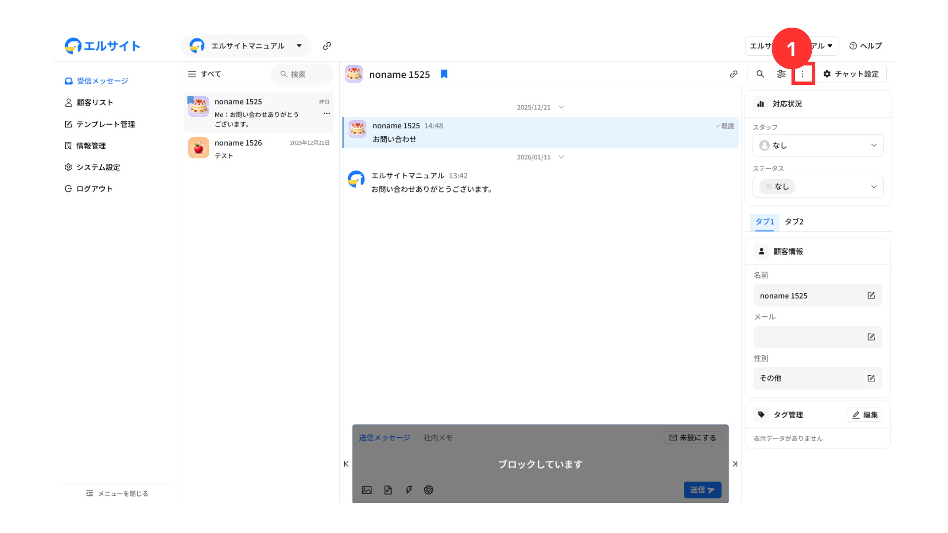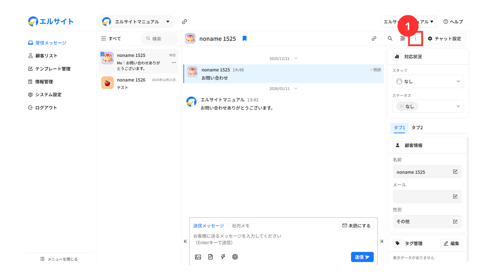 ①該当顧客のチャット欄から「三点リーダー」をクリック