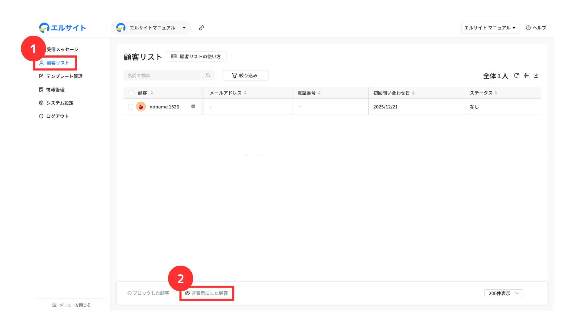 ②「非表示にした顧客」をクリック