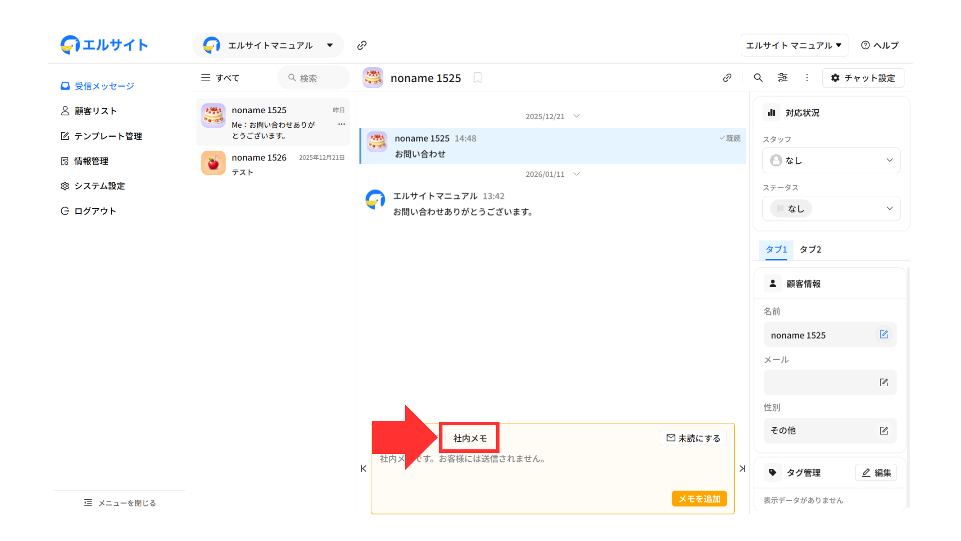 お客様には送信されず、社内共有としてメモできます。