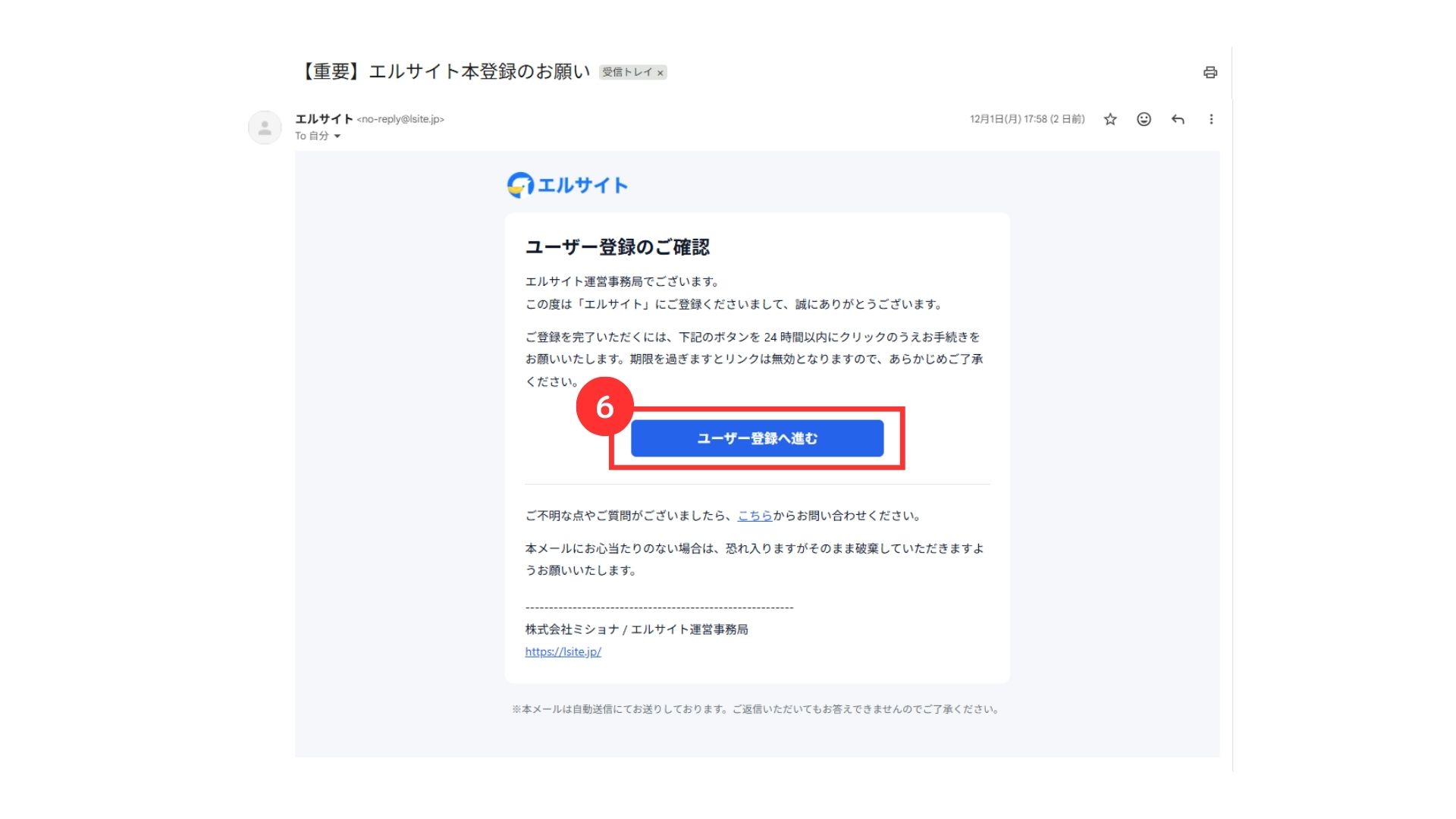 ・「【重要】エルサイト本登録のお願い」という件名で、メールが届きます。