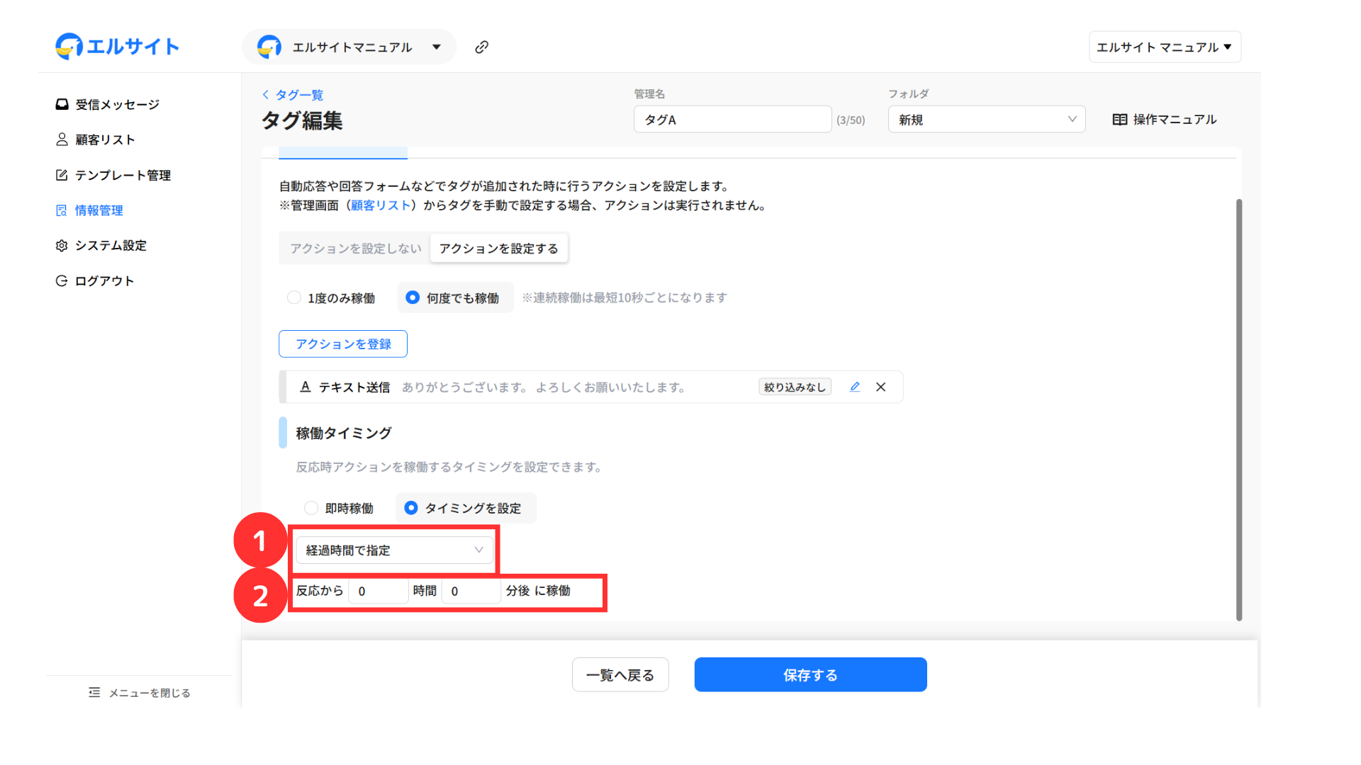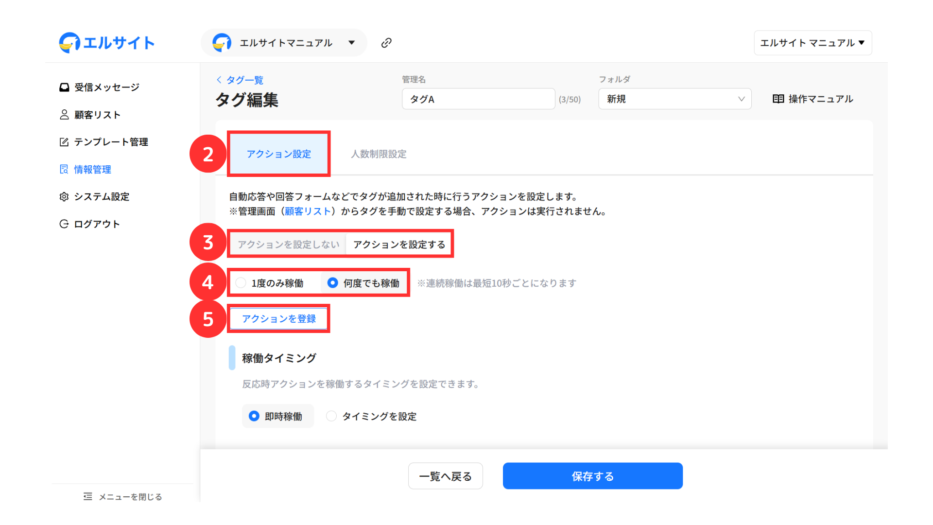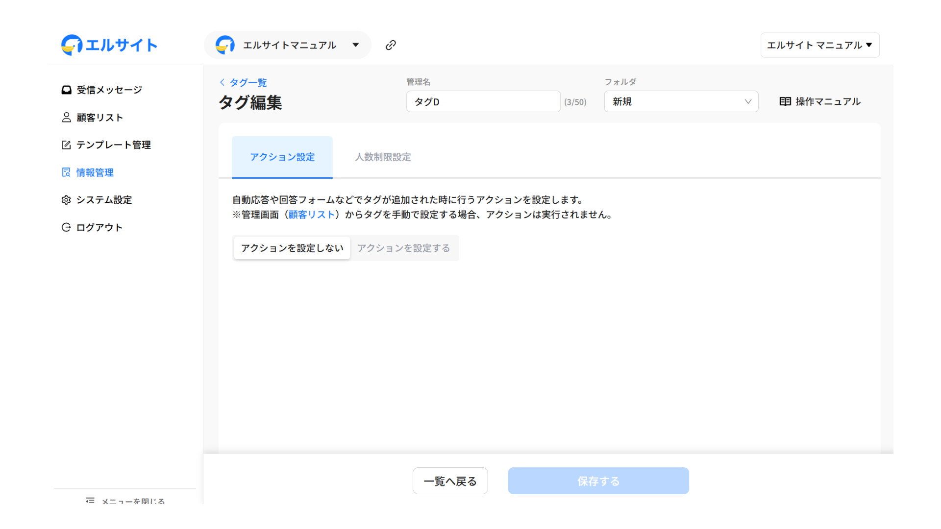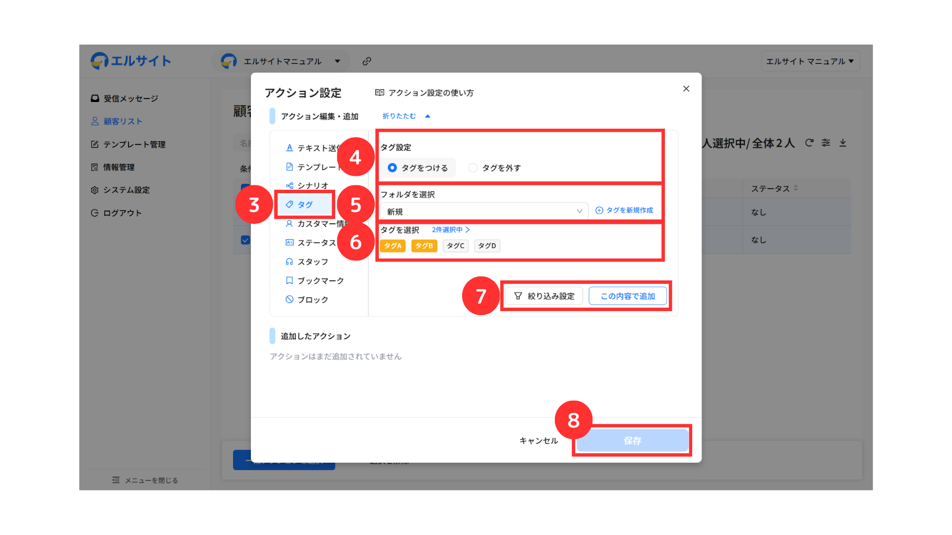 エルサイト内の各機能から自動でタグ付けを行う場合は、アクション設定画面から行います。