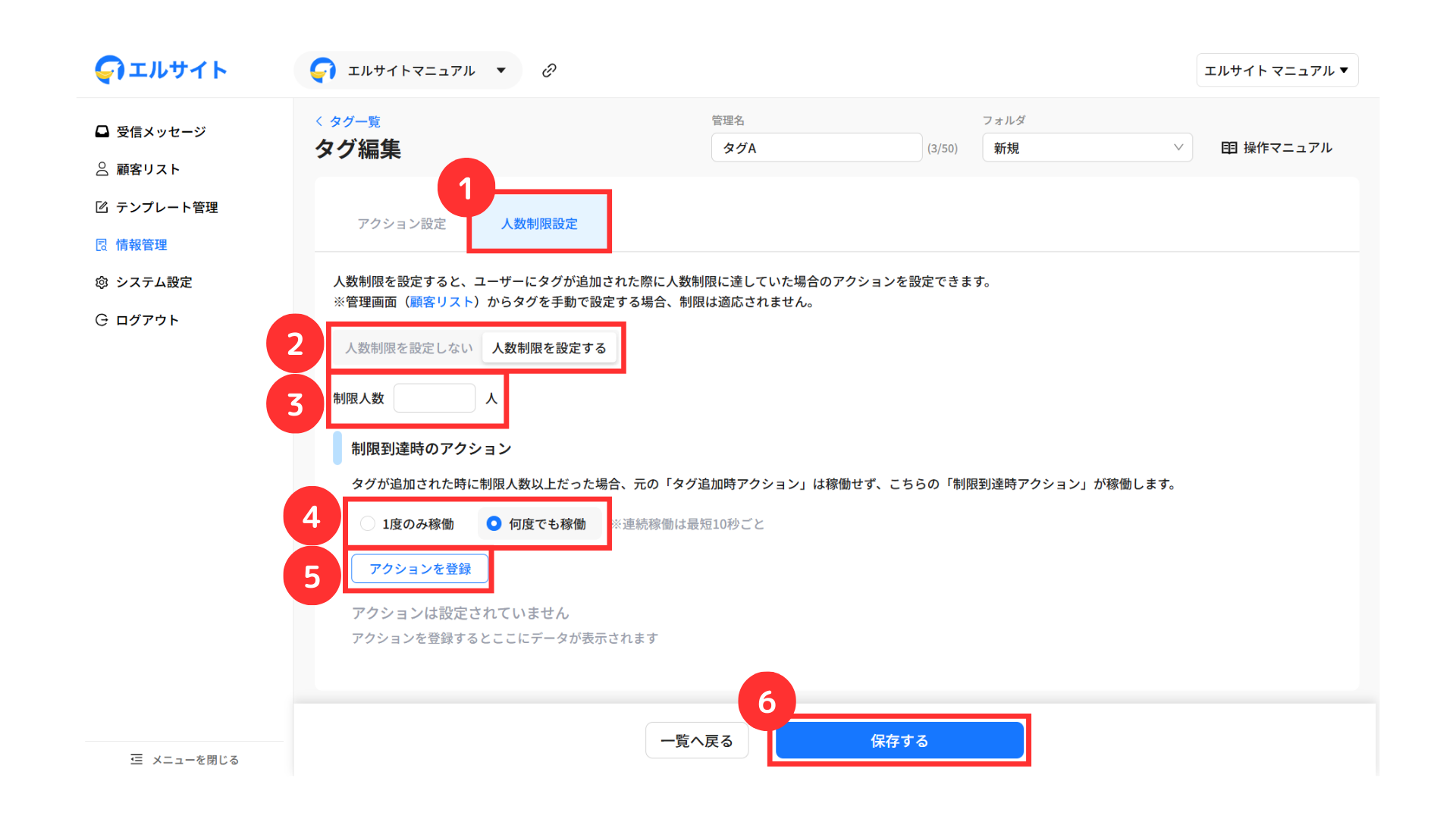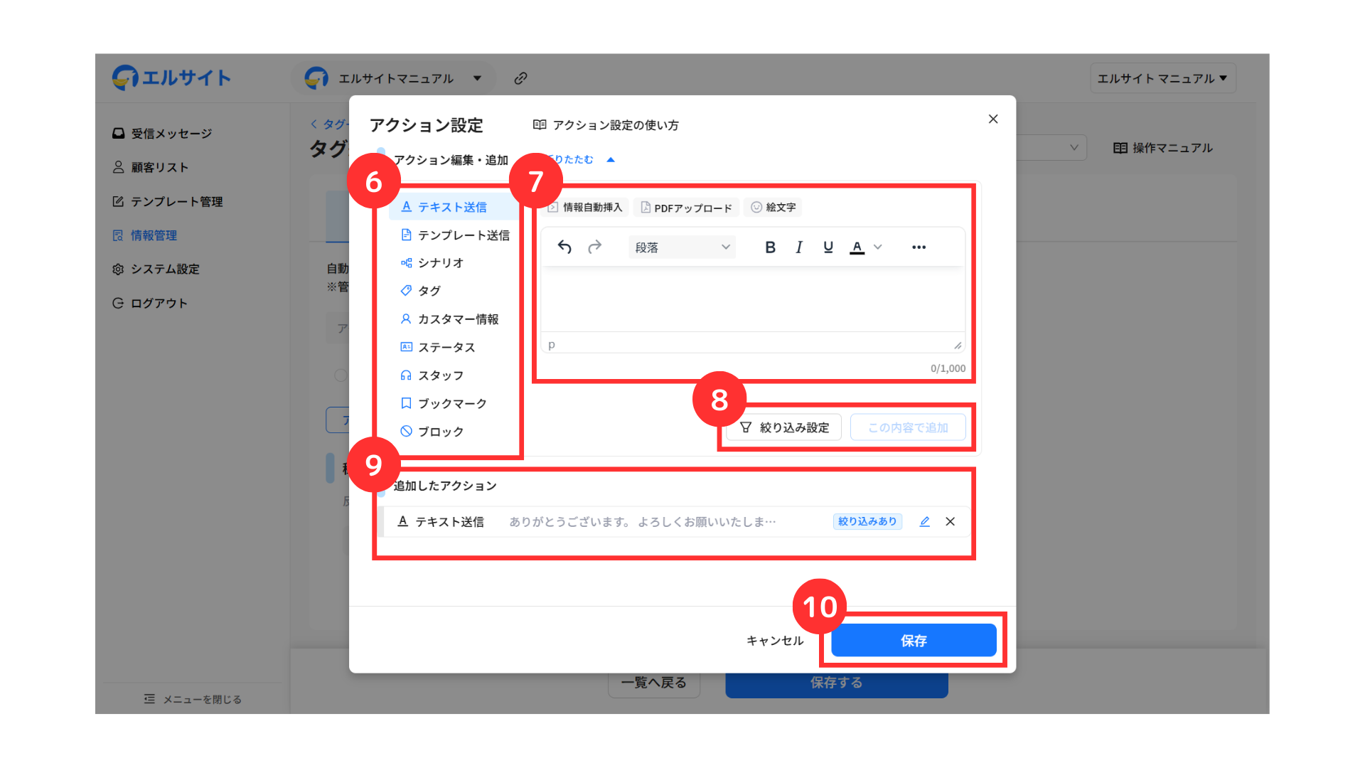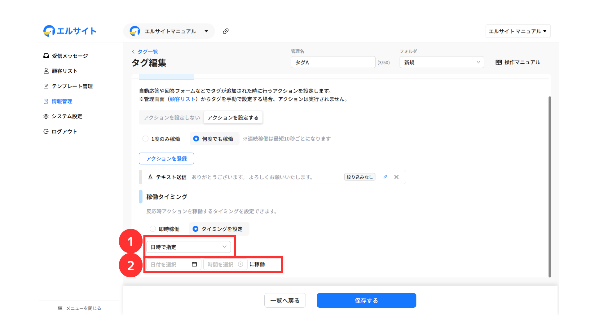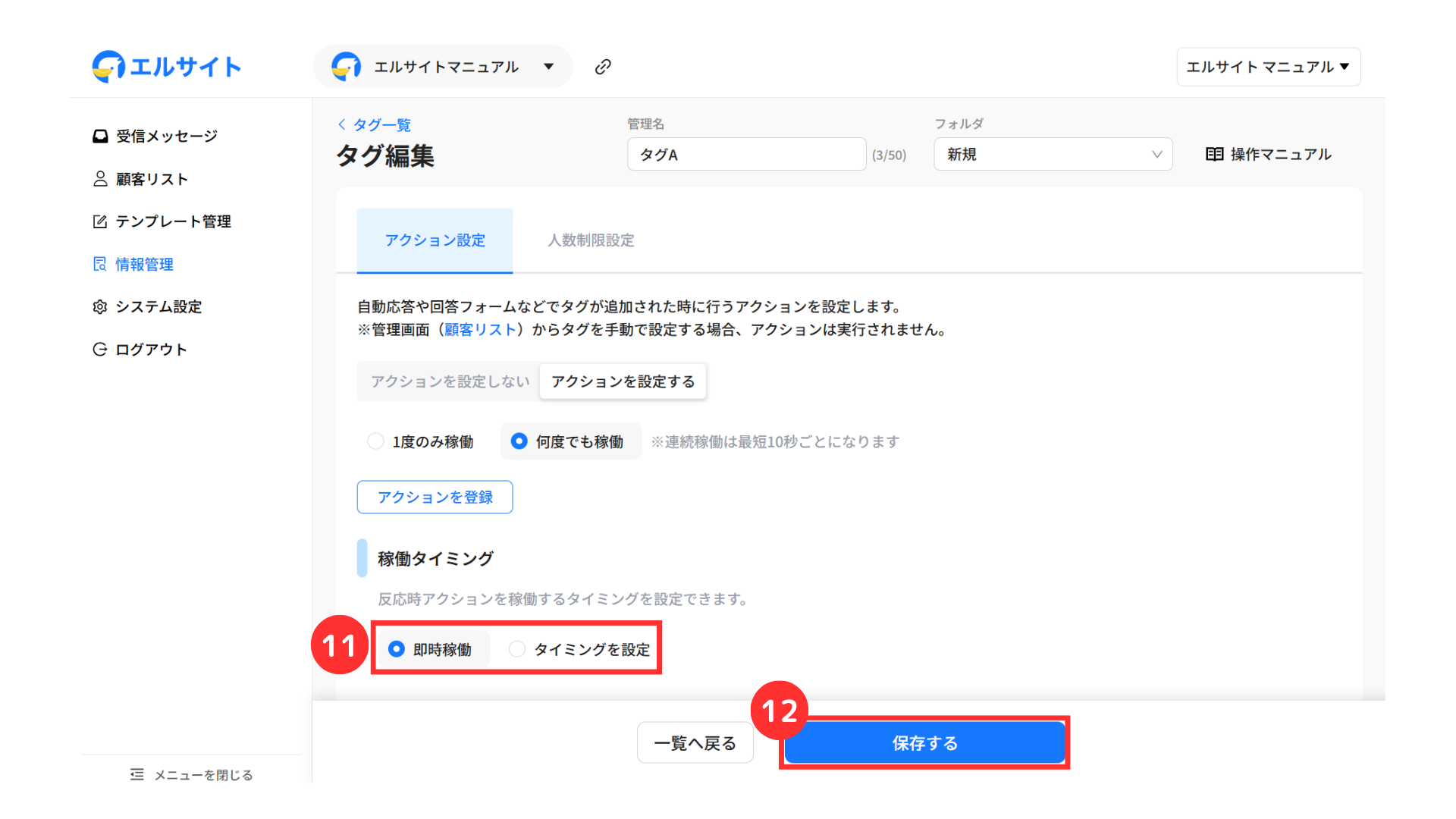 エルサイト内の各機能から自動でタグ付けを行う場合は、アクション設定画面から行います。