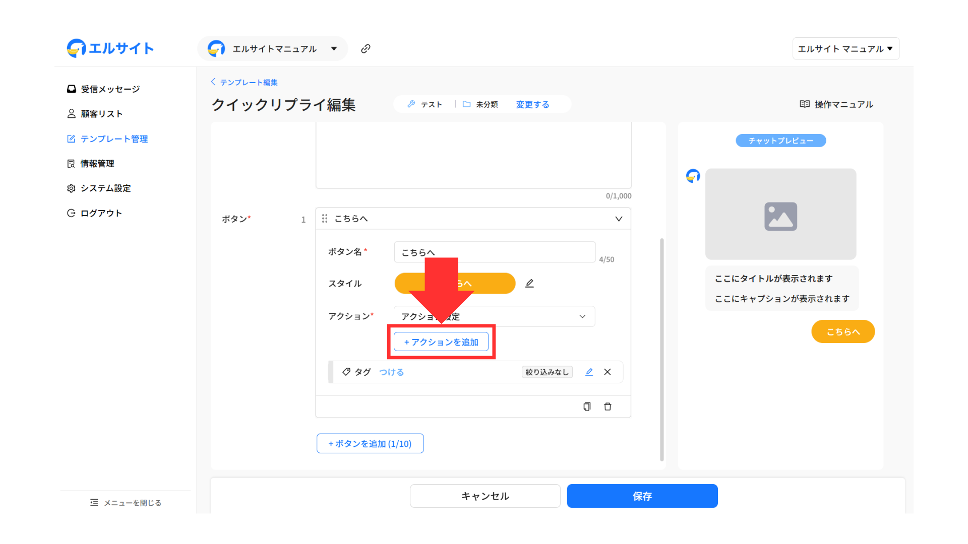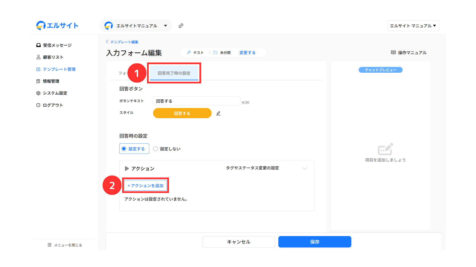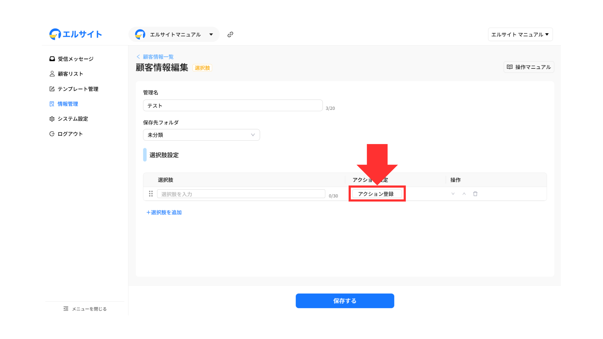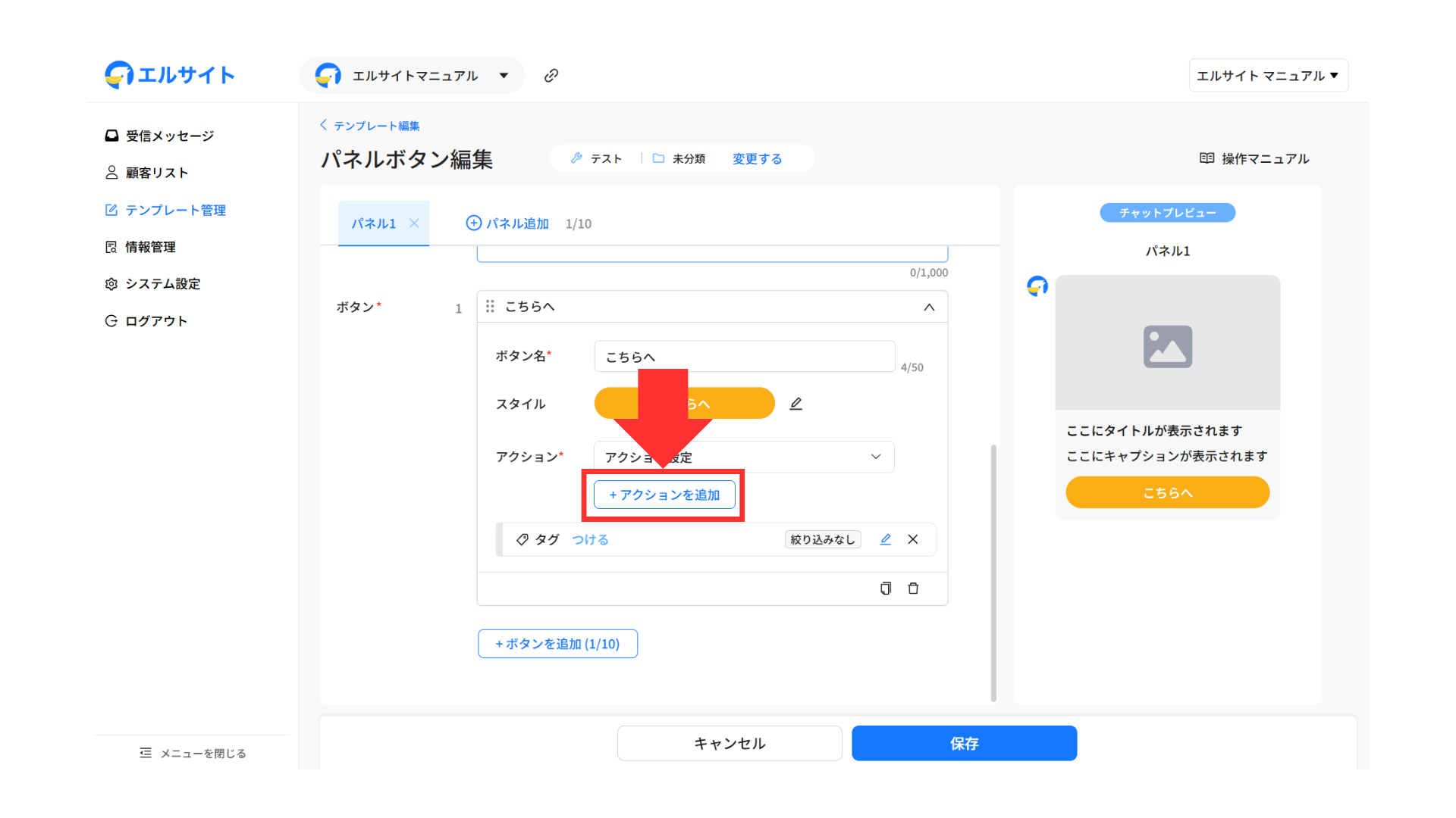 エルサイト内の各機能から自動でタグ付けを行う場合は、アクション設定画面から行います。