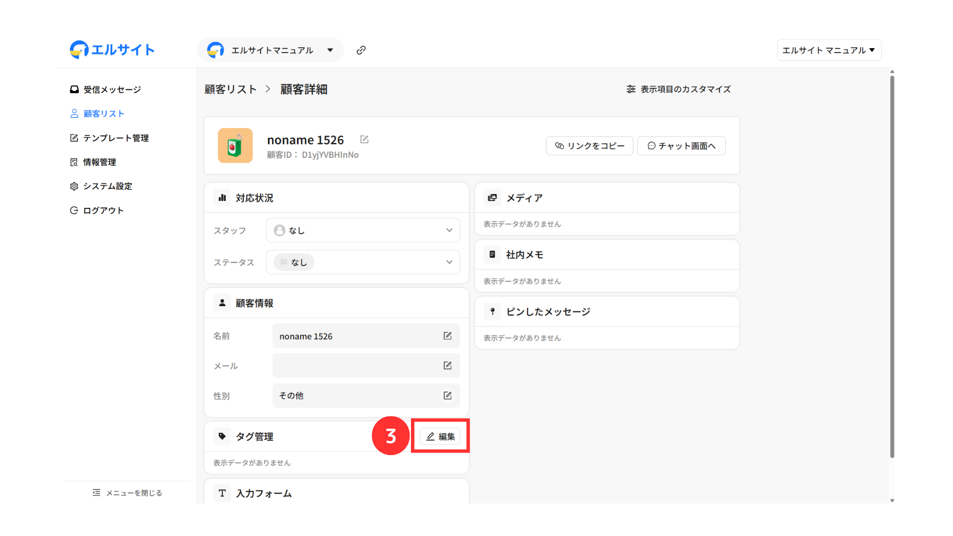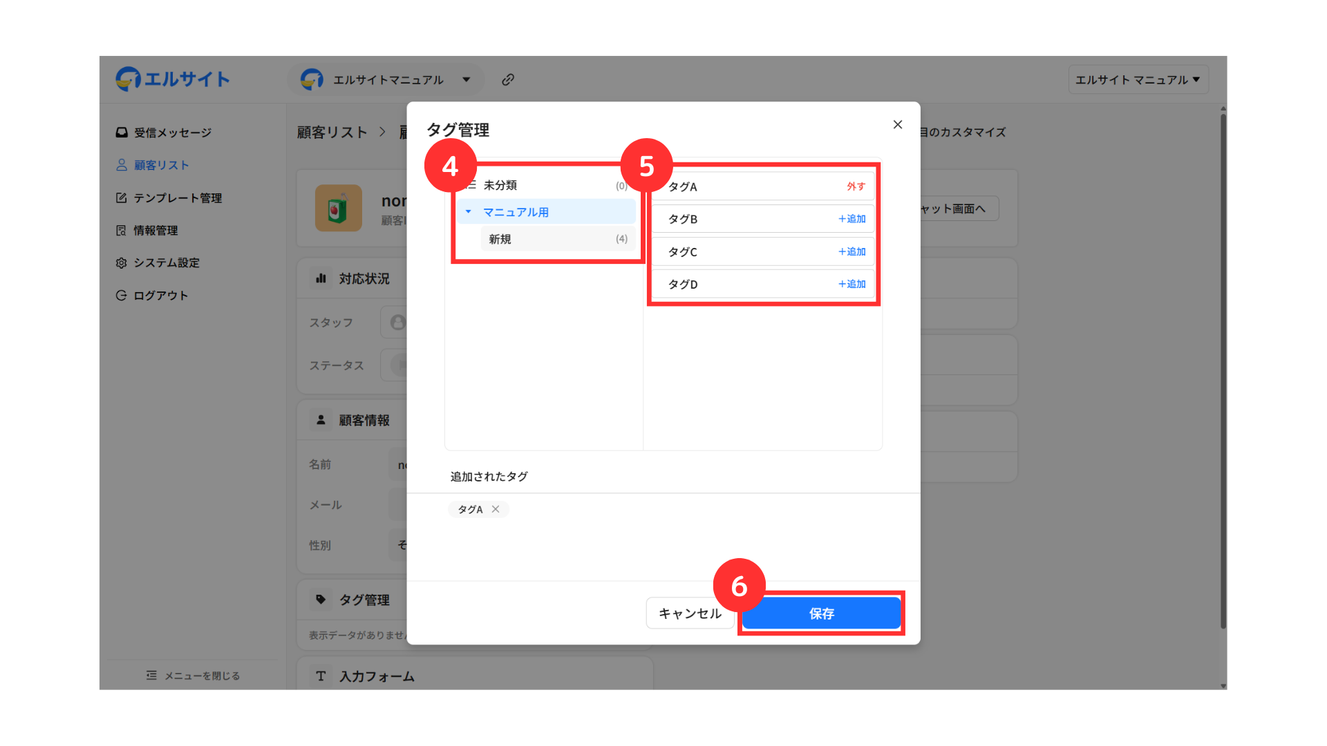 特定の顧客に対して手動でタグ付けの操作を行いたい場合は、以下の手順で行えます。