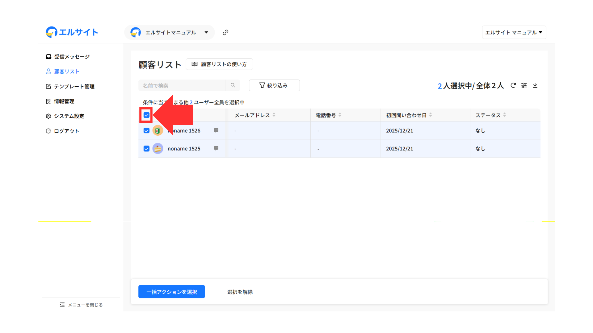 ②「一括アクションを選択」をクリック