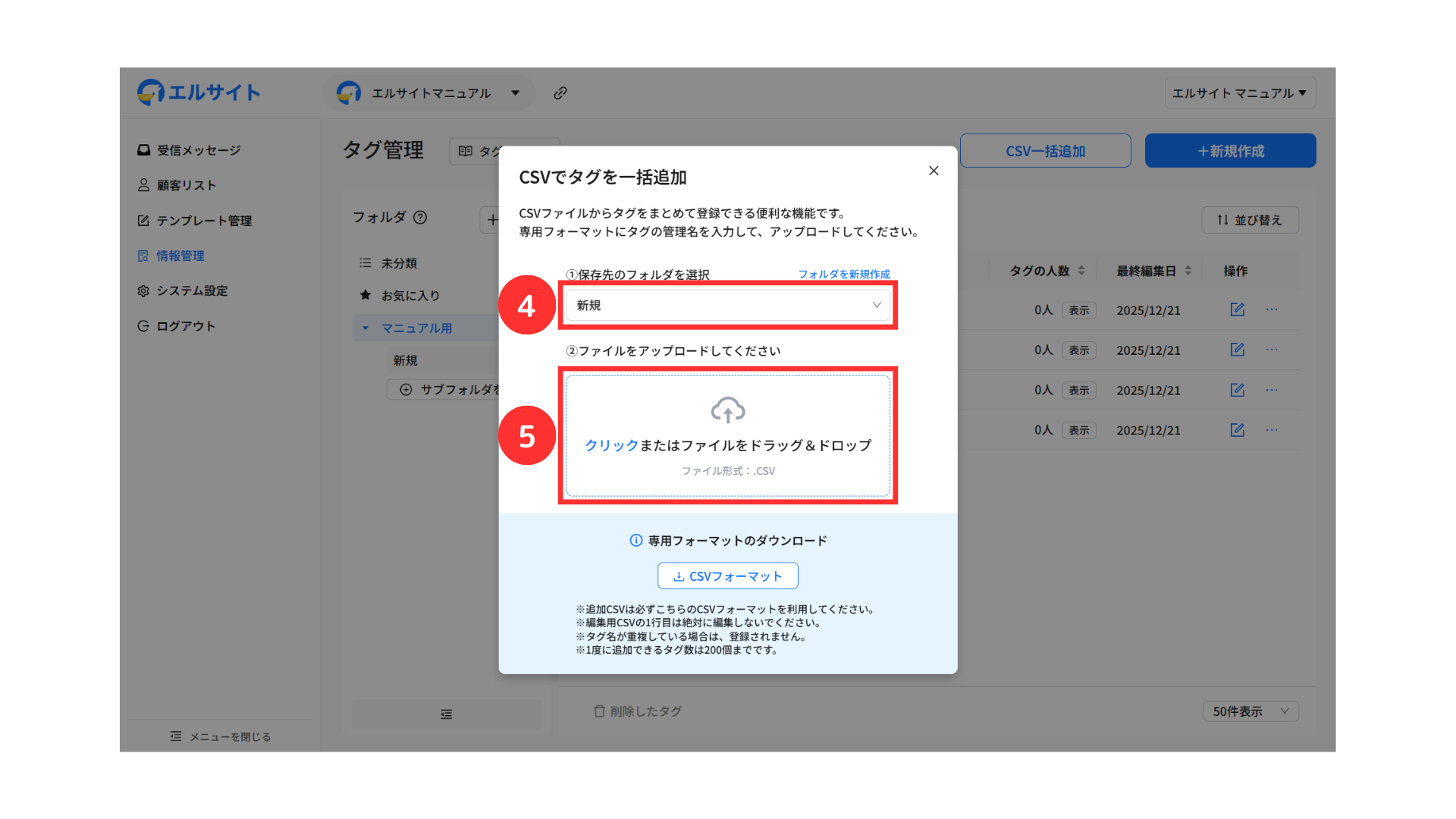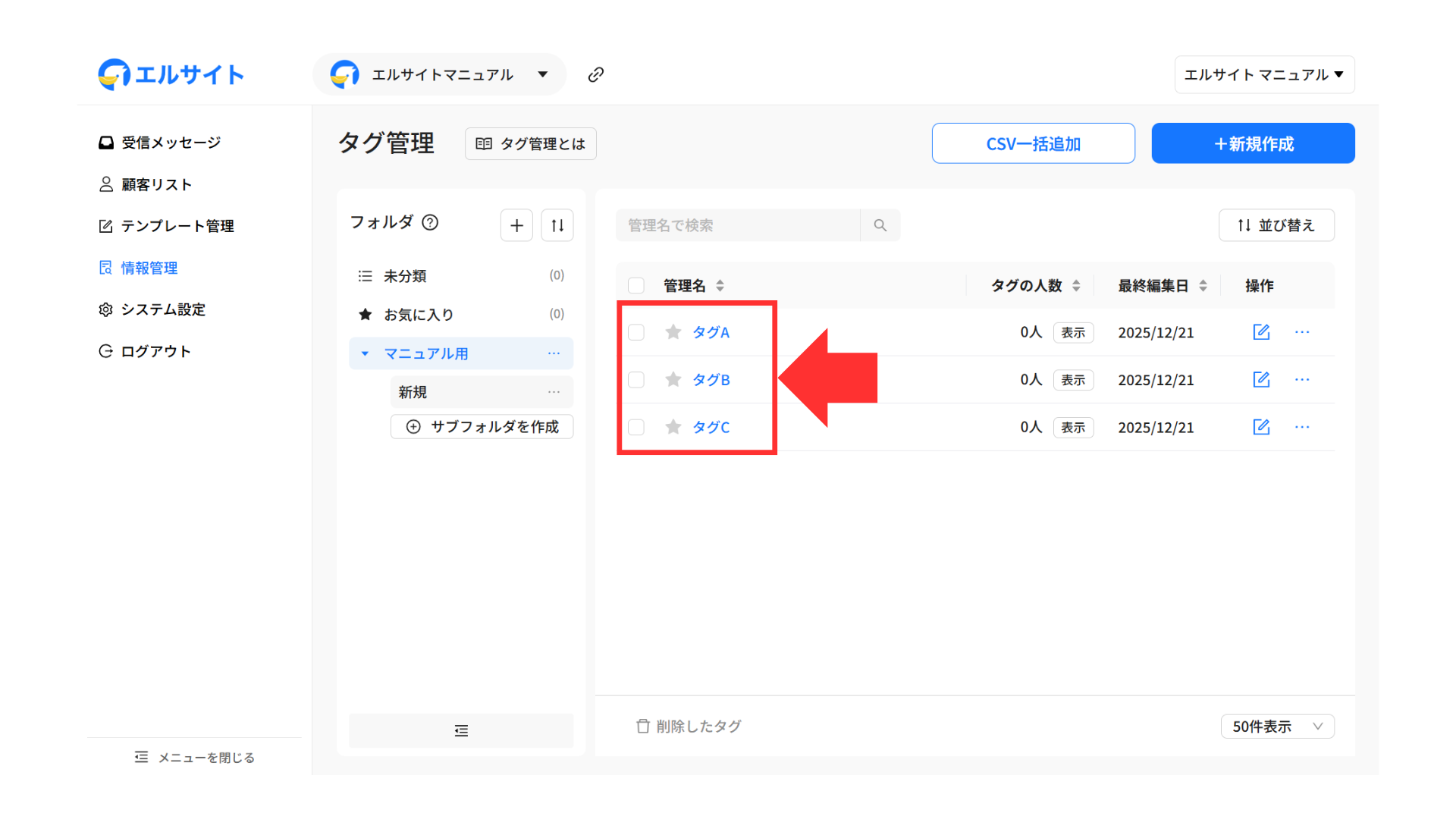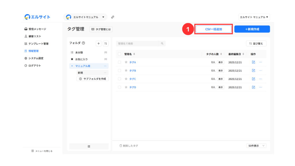 CSV一括追加では、CSVファイルを使ってタグを一括で作成できます。