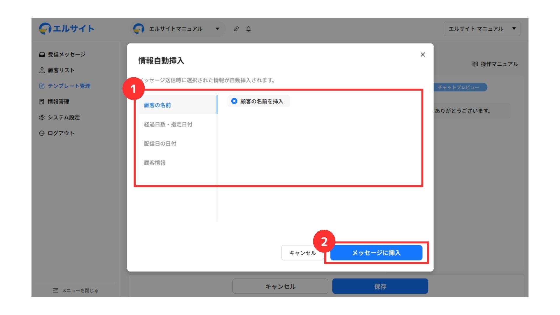 また、情報自動挿入により「ユーザー名」や「配信日」など、事前に取得したユーザーごとの情報を文中に差し込めます。