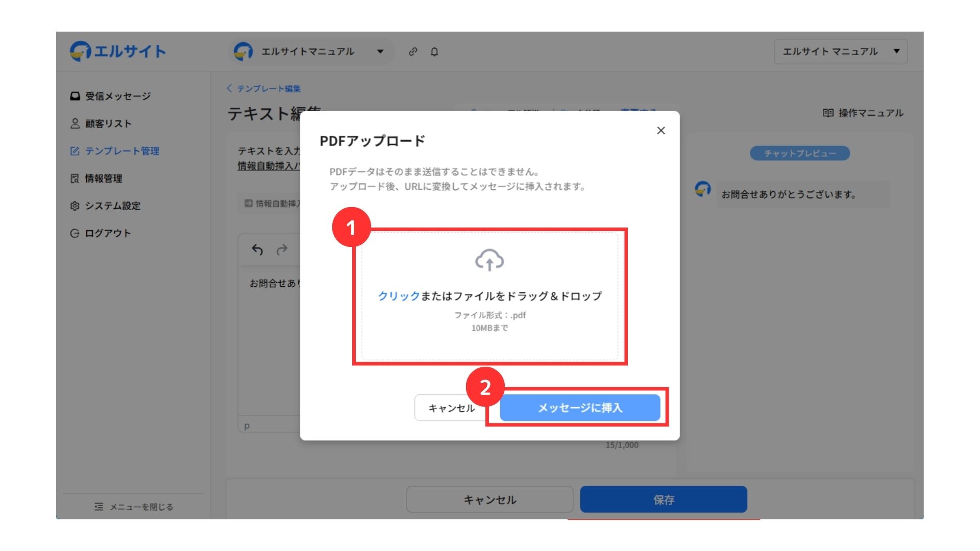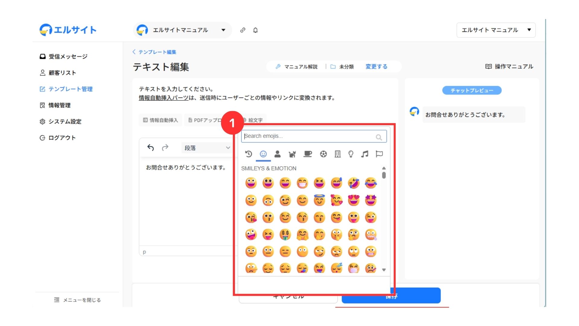 └ 情報自動挿入/PDFアップロード/絵文字の追加が可能
